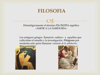 Este documento presenta una introducción a la filosofía, definiéndola etimológicamente como "amor a la sabiduría". Explica que surgió en la antigua Grecia como una forma de explicación racional del cosmos natural, opuesta a explicaciones sobrenaturales o mitológicas. También resume las principales ramas de la filosofía y sus objetivos, y afirma que aunque no persigue fines prácticos, la filosofía sirve para conocer la verdad y desarrollar una visión crítica de la realidad.
