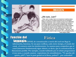 Este documento describe la función fática del lenguaje, que es verificar que el canal de comunicación entre los interlocutores sigue abierto mediante expresiones como "¿me escuchas?" o "¿me entiendes?". Explica que se usa para comprobar que la comunicación física es posible y mantiene el contacto. Proporciona ejemplos de esta función en conversaciones telefónicas, fiestas, escuelas, iglesias, piscinas y discotecas.