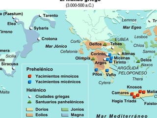 El documento proporciona información sobre la historia y cultura de la antigua Grecia. Resume que Grecia estaba formada por la península balcánica, el Peloponeso y muchas islas mediterráneas. Tuvo tres etapas principales: la civilización minoica en Creta, la civilización micénica en el Peloponeso y la época oscura. Luego surgen las polis y se desarrollan la democracia en Atenas y la oligarquía en Esparta. Atenas y Esparta tuvieron enf