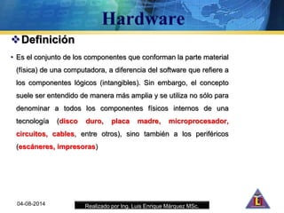 El documento clasifica y describe varios componentes de hardware de computadoras. Explica que el hardware incluye componentes internos como la tarjeta madre, CPU y memoria, así como periféricos externos como teclado, mouse e impresoras. Además, clasifica el hardware por funcionalidad, ubicación, flujo de información y más.