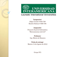 Este documento presenta un proyecto final sobre herramientas web 2.0 realizado por dos estudiantes para su profesora Ing. María de Dimares el 14 de agosto de 2012. El proyecto introduce las características de las herramientas web 2.0 como blogs, wikis, YouTube y etiquetado colaborativo, así como sus ventajas y desventajas.