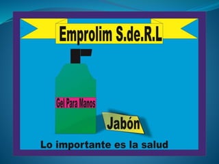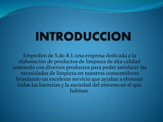 Emprolim S.de.R.L es una empresa dedicada a la elaboración de productos de limpieza de alta calidad con el objetivo de ser líderes en el mercado, ofreciendo diversos productos e innovaciones para satisfacer las necesidades de limpieza de los consumidores y brindar un excelente servicio. Su misión es proveer productos de calidad con accesibilidad para los clientes. Su visión es cumplir con un mercado meta y ser reconocidos a nivel local, nacional e internacional.