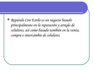 Repáralo Con Estilo es un negocio de reparación y venta de celulares y otros dispositivos electrónicos. Ofrece servicios de reparación de celulares, computadoras y laptops utilizando piezas compradas en línea. El negocio también vende una variedad de celulares nuevos y usados incluyendo Blackberry, Android e iPhones para satisfacer las necesidades de clientes.