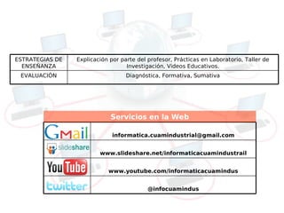 La unidad curricular Informática Básica se ofrece en el segundo semestre con 4 horas semanales de clase y prácticas de laboratorio. El curso busca desarrollar las competencias necesarias para usar las tecnologías de información y comunicación en el ámbito académico y profesional mediante explicaciones del profesor, prácticas en laboratorio, talleres de investigación y videos educativos, evaluando el aprendizaje de forma diagnóstica, formativa y sumativa.