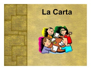 El documento describe los tipos y estructura básica de las cartas. Explica que las cartas formales se usan para asuntos específicos como trámites de trabajo y tienen un lenguaje más serio, mientras que las cartas informales se usan para cualquier tema entre amigos y familiares con un lenguaje más coloquial. Además, detalla que todas las cartas deben incluir la fecha, saludo, cuerpo del mensaje, despedida y firma, y que las cartas formales también incluyen membrete y que todas deben enviarse en un sobre