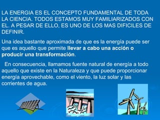 La energía es un concepto fundamental en ciencia que permite realizar acciones y transformaciones. Existen diferentes formas de energía como cinética, química, térmica y eléctrica, y siempre que se produce una conversión entre ellas hay una transformación de energía. La energía se mide comúnmente en joules o kilojoules, y existen diferentes tipos como la energía mecánica (cinética y potencial) y la potencial gravitatoria y elástica.