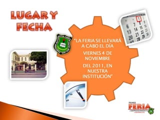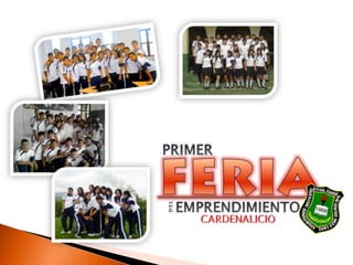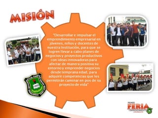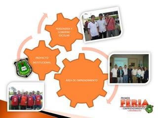 El documento presenta un proyecto institucional que incluye un área de emprendimiento, un proyecto productivo y un plan de negocios con ideas innovadoras para una feria de temas.