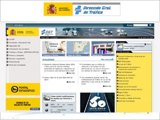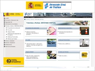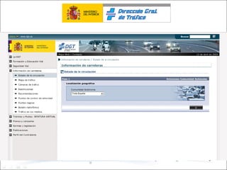 El documento describe la Dirección General de Tráfico y sus funciones de gestión administrativa del sistema de tráfico a través de las Jefaturas Provinciales de Tráfico. También menciona recursos en la página web de la DGT como test de exámenes de conducir, estadísticas de accidentes, información sobre el estado de carreteras, y trámites administrativos online.