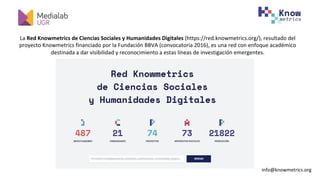 La Red Knowmetrics de Ciencias Sociales y Humanidades Digitales es una red académica creada para dar visibilidad a las investigaciones emergentes en estas áreas. La red permite mapear investigadores de todo el mundo con intereses en lo digital y ofrece perfiles de investigadores que incluyen datos sincronizados con Google Scholar, identidad digital, uso de redes sociales y participación en proyectos y comunidades.