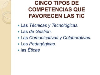 El documento presenta el equipo de gestión de uso de TIC en el ITICSA, el cual está conformado por el rector, coordinadores, docentes, estudiantes, egresados y padres de familia. Además, describe cinco tipos de competencias que favorecen las TIC y resume los objetivos, justificación, visión y misión del plan de gestión de uso de TIC en la institución.