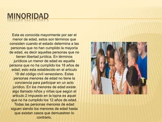 El documento habla sobre varios temas relacionados con el derecho de familia en Venezuela. Explica conceptos como la minoría, la mayoría de edad, la patria potestad, la guarda, la emancipación y la adopción. Describe los derechos y obligaciones de los padres sobre los hijos menores de edad y los cambios que ocurren legalmente cuando un hijo alcanza la mayoría de edad.