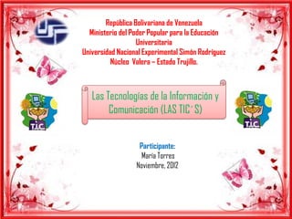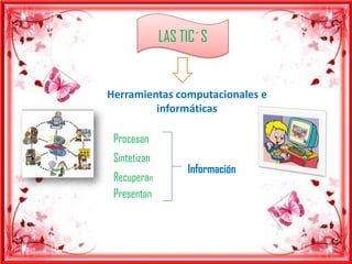 El documento habla sobre las Tecnologías de la Información y la Comunicación (TIC's) y cómo pueden usarse para mejorar la educación virtual. Explica que las TIC's procesan, sintetizan e informan datos a través de elementos como televisores, radio, internet y celulares. También destaca que las TIC's pueden usarse para fomentar la imaginación, la investigación científica y despertar el interés entre estudiantes y profesores.