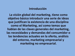 Este documento presenta una visión general del marketing. Explica las cinco claves generales del marketing como buscar mercados interesantes, oferta y consumo globales, que el consumidor compra según lo que percibe, innovar antes de inventar, y diferenciarse. También discute temas como las necesidades y demandas del consumidor, tendencias en la oferta, análisis del entorno, marketing empresarial y no empresarial, y las funciones básicas del marketing.