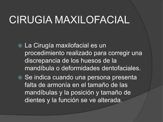 Este documento describe la cirugía maxilofacial, incluyendo los procedimientos, beneficios y tipos. La cirugía maxilofacial corrige discrepancias óseas de la mandíbula o deformidades dentofaciales para mejorar la apariencia, función y prevenir problemas. Los procedimientos se realizan dentro de la boca para evitar cicatrices visibles, y los beneficios incluyen mejorar la función masticatoria.