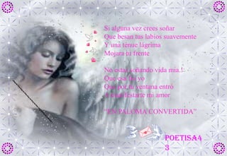 Si alguna vezcrees soñarQue besan tus labios suavementeY una ténue lágrimaMojara tu frenteNo estas soñando vida mia.!Que esa fui yoQue por tu ventana entróA manifestarte mi amor“EN PALOMA CONVERTIDA”poetisa43