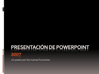 Este documento presenta las nuevas funciones de PowerPoint 2007, incluyendo mejoras en texto, gráficos, imágenes, SmartArt, temas y estilos, y diseños de diapositivas. Muestra ejemplos de cómo estas nuevas funciones pueden usarse para crear presentaciones más efectivas.