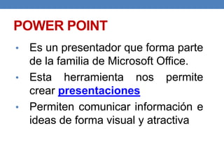 PowerPoint es un programa de Microsoft que permite crear presentaciones visuales y atractivas para comunicar información e ideas de manera efectiva. Las presentaciones en PowerPoint deben seguir principios como la sencillez, el contraste de colores y la inclusión de sólo datos e imágenes imprescindibles. Se recomienda usar un diseño y fuente simples en todas las diapositivas, con tamaños de letra grandes para su legibilidad. Las presentaciones también se pueden realizar en línea usando herramientas gratuitas.