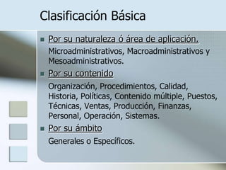 Este documento describe diferentes tipos de manuales administrativos, incluyendo sus propósitos, contenidos y estructuras. Explica que los manuales de organización, procedimientos y calidad sirven para comunicar y coordinar información sobre la estructura, funciones, procesos y sistemas de calidad de una organización.