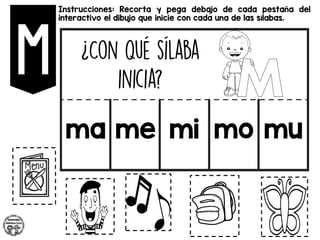 Este cuadernillo presenta instrucciones para identificar sílabas simples en palabras y oraciones cortas. Se pide al estudiante que recorte y pegue imágenes que inicien con cada sílaba, complete palabras con las sílabas faltantes, subraye sílabas en palabras y oraciones dados, y lea palabras y oraciones. El objetivo es practicar el reconocimiento y pronunciación de sílabas.