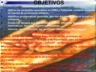 El documento describe un proyecto solidario realizado por alumnos de 3o 3a de la Escuela N° 4-031 "Dr. Francisco Correas" en la Escuela Marchionatto de Luján. El proyecto consistió en diferentes actividades educativas y lúdicas organizadas por distintas áreas como deportiva, matemática y literatura para alumnos de jardín de infantes hasta 7o grado. El objetivo era aplicar contenidos aprendidos de manera solidaria y generar un espacio de aprendizaje y diversión para los niños.