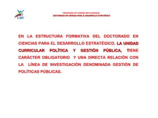 Este documento presenta el programa de estudios de la unidad curricular de Política y Gestión Pública para el doctorado en Ciencias para el Desarrollo Estratégico. La unidad curricular es obligatoria y está relacionada con la línea de investigación en Gestión de Políticas Públicas. El curso ofrece herramientas de análisis crítico para explorar los procesos de formulación, implementación y evaluación de políticas públicas desde una perspectiva integradora de la gestión pública.