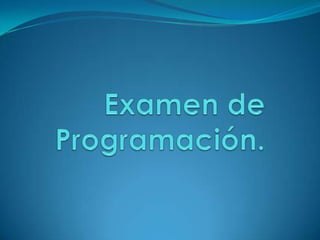 Este documento presenta un resumen de un examen sobre programación que incluye temas como fases de solución, algoritmos, pruebas de escritorio y diagramas de flujo. También propone estrategias para mejorar el cuidado del agua potable como establecer horarios de suministro, conferencias e impedir el mal uso del agua. Finalmente, presenta un algoritmo para calcular el volumen de un tinaco.