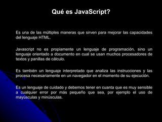 El documento describe conceptos fundamentales de algoritmos, programas y lenguajes de programación. Explica que un algoritmo es un proceso de pasos para resolver un problema, un programa son instrucciones para una computadora, y un lenguaje de programación son las instrucciones que entiende una computadora. Luego profundiza en JavaScript, variables, entrada de datos, estructuras secuenciales y condicionales en este lenguaje. Finalmente presenta operadores lógicos y la estructura switch.