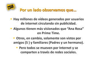El documento habla sobre la oportunidad que representa el mercado de la publicidad en videos generados por usuarios en Internet. Millones de estas videos circulan sin publicidad a pesar de tener muchas vistas, y los anunciantes quieren contactar con esta nueva audiencia que pasa mucho tiempo viendo videos en línea. Se propone una plataforma que conecte a anunciantes, creadores de contenido y distribuidores para que todos puedan beneficiarse de la monetización de la publicidad de una manera justa y transparente.