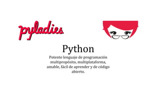 El documento presenta a PyLadies, un grupo internacional que busca empoderar a mujeres para convertirse en líderes en la comunidad de código abierto Python. Detalla los objetivos de la organización, como promover el uso de Python y proporcionar apoyo a través de capítulos locales y eventos. También menciona la colaboración con la Python Software Foundation para fomentar el crecimiento de esta comunidad.