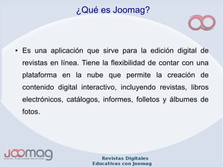 Joomag es una aplicación en línea gratuita que permite la creación y edición de revistas digitales interactivas. Ofrece características como almacenamiento en la nube, uso de etiquetas para organizar contenido, y capacidad de actualizar y difundir información de manera más económica y accesible que las revistas impresas. Las revistas digitales educativas creadas con Joomag apoyan los procesos de enseñanza y aprendizaje en la universidad a través de recursos didácticos multimediales.