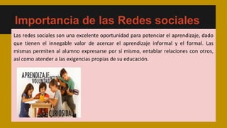 Las redes sociales permiten acercar el aprendizaje informal y formal, permitiendo a los alumnos expresarse, entablar relaciones y atender a sus necesidades educativas. Una red social es una estructura social formada por personas conectadas por relaciones o intereses comunes, que se puede representar mediante gráficos. Las redes sociales se basan en los usuarios, son interactivas, establecen relaciones, intercambian información e intereses, y ofrecen variedad de servicios. Las más usadas son Facebook, Google+, YouTube y Twitter.