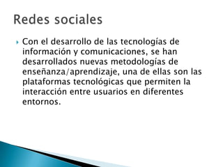 Las redes sociales permiten nuevas metodologías de enseñanza y aprendizaje a través de plataformas tecnológicas que facilitan la interacción entre usuarios. Estas plataformas aprovechan las tecnologías de información para desarrollar formas diferentes de aprendizaje mediante el intercambio entre personas en diversos entornos.