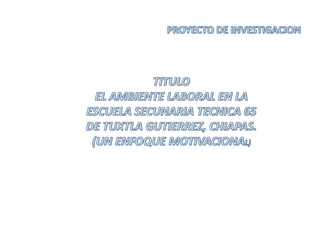 La escuela secundaria técnica 65 se fundó en 1986 en Tuxtla Gutiérrez, Chiapas con 5 grupos y 145 alumnos. Actualmente cuenta con 33 grupos y una plantilla de 75 trabajadores. El documento analiza el ambiente laboral en la escuela a través de una encuesta de 20 preguntas aplicada a 46 trabajadores. Los objetivos son identificar, revisar y diseñar el control interno de los trabajadores para mejorar el ambiente laboral, el cual se considera inadecuado debido a falta de análisis y diseño del control interno