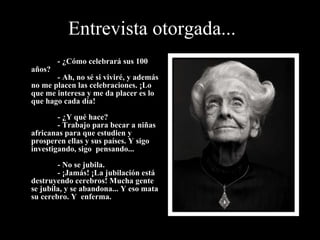 Rita Levi-Montalcini, una neuróloga italiana de 100 años de edad y ganadora del Premio Nobel de Medicina, continúa trabajando activamente investigando y ayudando a niñas africanas a estudiar. A pesar de su edad avanzada, mantiene su cerebro activo e ilusionado trabajando diariamente. Cree firmemente que mantener el cerebro estimulado a través de la curiosidad y las pasiones es la clave para evitar la degeneración cerebral. Su pasión por la investigación científica comenzó cuando era joven