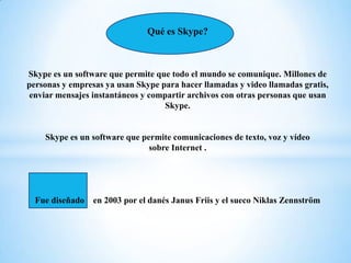 Skype es un software gratuito que permite realizar llamadas de voz y video llamadas, enviar mensajes instantáneos y compartir archivos entre usuarios de Skype. Fue creado en 2003 y permite la comunicación a través de Internet. Además de estas funciones básicas, Skype ofrece servicios pagos como SkypeIn que proporciona un número de teléfono y buzón de voz, y SkypeOut que permite llamar a teléfonos fijos y móviles a bajos costos. La interfaz de Skype es similar a otros programas de
