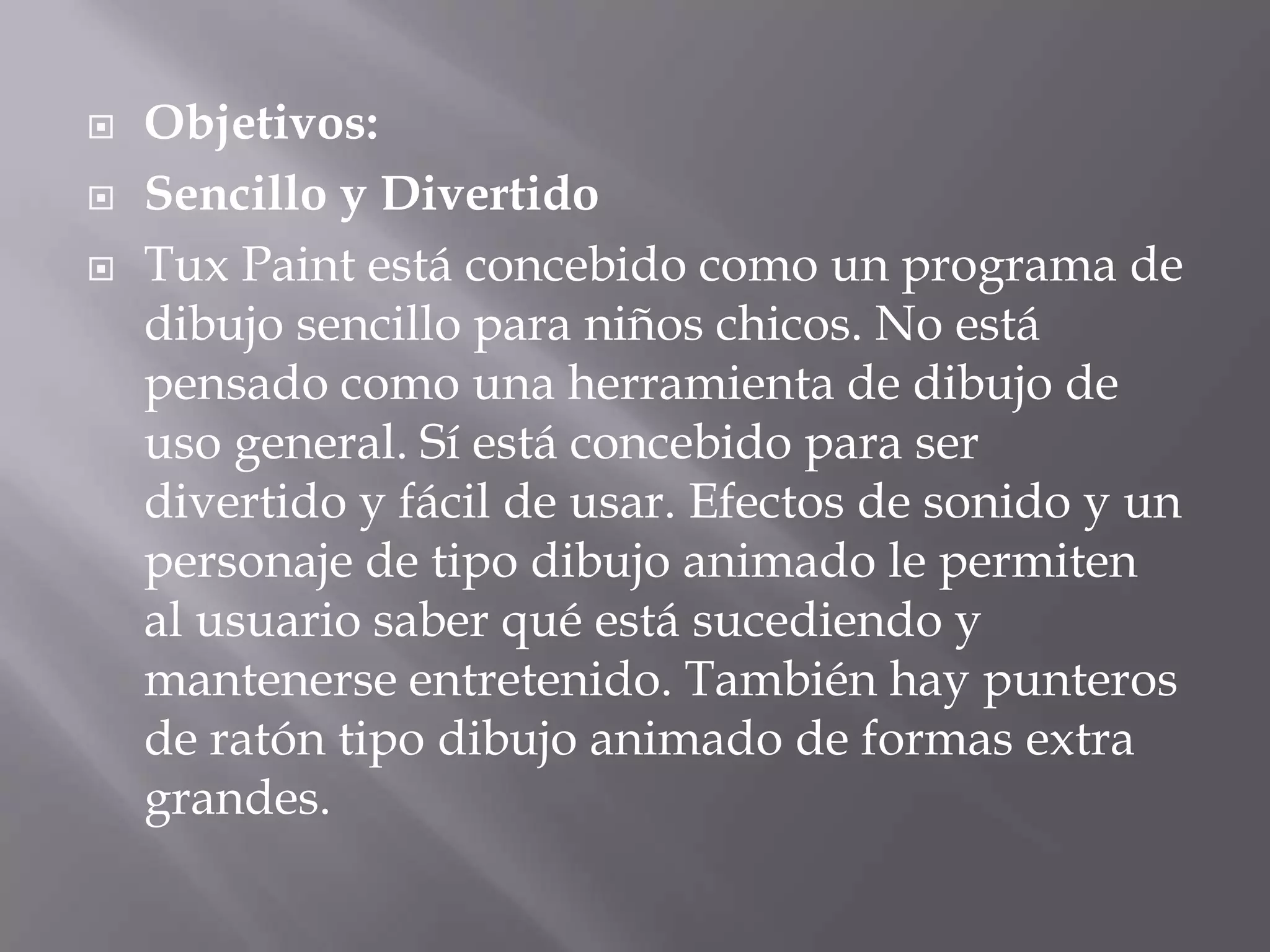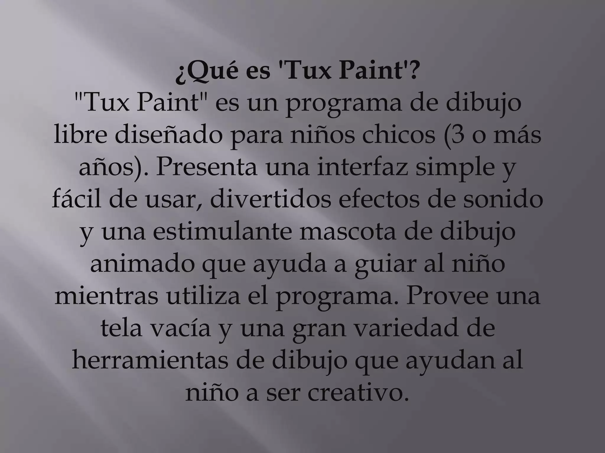 Tux Paint es un programa de dibujo gratuito diseñado para niños pequeños que presenta una interfaz simple y divertidos efectos de sonido. Permite a los niños dibujar de forma creativa usando herramientas como pinceles, sellos y figuras mientras una mascota animada guía al usuario.