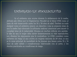 El documento habla sobre el embarazo en adolescentes. Menciona que la OMS considera embarazo de riesgo el que ocurre en mujeres menores de 20 años. El embarazo en la adolescencia representa problemas de salud, sociales y económicos, e incide en la exclusión y desigualdad. También presenta el caso de Antonieta, una adolescente de 16 años que quedó embarazada sin educación sexual. Finalmente, cita las bases legales que protegen el derecho a la educación sexual integral desde la niñez.