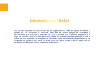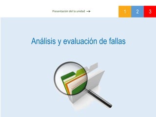 Este documento presenta los objetivos y temario de una unidad sobre análisis y evaluación de fallas. Los objetivos son conocer los conceptos de confiabilidad y fiabilidad, interpretar datos estadísticos, y aplicar herramientas para mejorar procesos. El temario cubre introducción a la fiabilidad, análisis de fallas, y modelización de la confiabilidad.