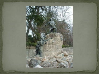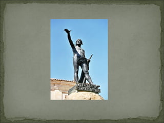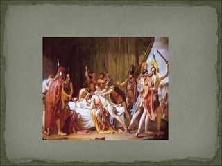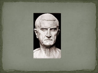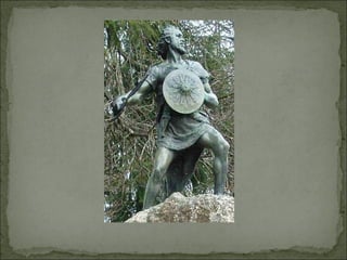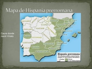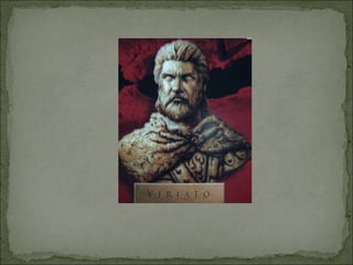Viriato era un líder lusitano que luchó contra los romanos en el siglo II a.C. después de que estos traicionaran un acuerdo de paz con los hispanos. Viriato recorrió Hispania reclutando un gran ejército para derrotar a Roma, usando tácticas como fingir ser menos numerosos. Eventualmente, sus propios embajadores lo asesinaron mientras dormía a cambio de dinero de los romanos, poniendo fin a la resistencia hispana e iniciando la conquista total de Roma