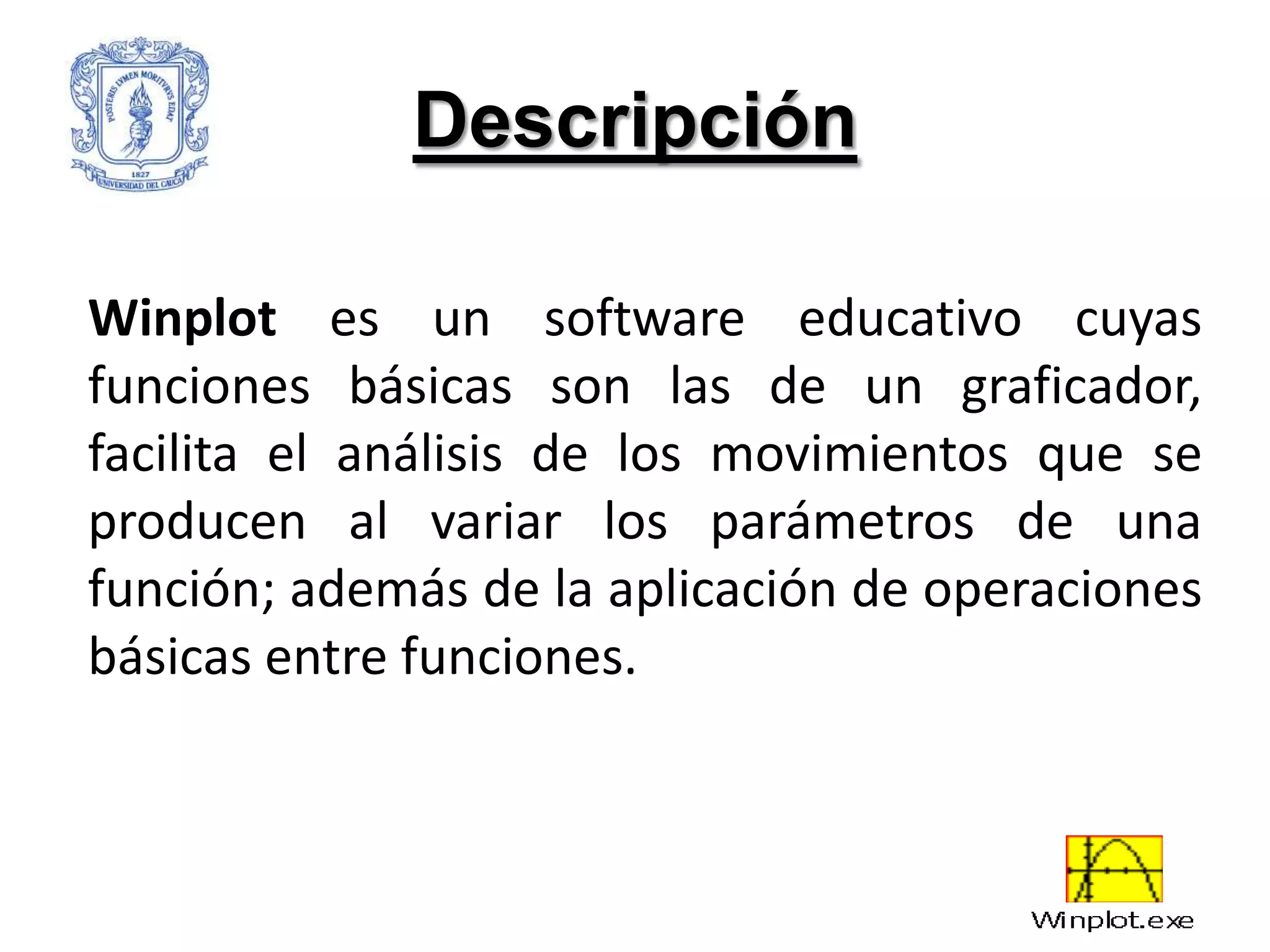 Winplot es un software educativo gratuito para crear y analizar gráficos de funciones. Permite visualizar el efecto de variar parámetros en funciones, aplicar operaciones entre funciones, y derivar e integrar funciones. Ofrece opciones para crear gráficos en 2D y 3D, adivinar funciones a partir de gráficos, y estudiar sistemas dinámicamente mediante la manipulación de variables.