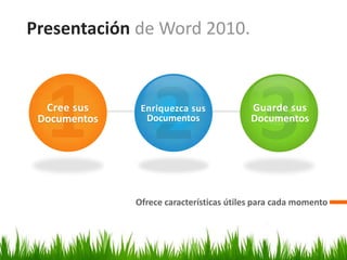 El documento presenta las nuevas características de Microsoft Word 2010, destacando mejoras en la colaboración, navegación y edición de documentos. Incluye funciones como formatos de numeración, control de contenido, efectos artísticos, y herramientas de diseño gráficas que mejoran la presentación de textos e imágenes. Además, se menciona la facilidad para crear y guardar documentos, así como la opción de utilizar plantillas y temas para un resultado más profesional.