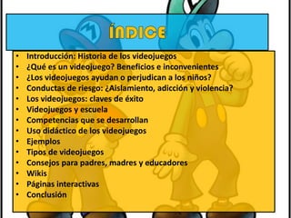 Este documento resume los principales puntos sobre los videojuegos: su historia, definición, beneficios y riesgos para los niños, tipos de videojuegos, y su uso educativo. También ofrece consejos para padres y educadores sobre cómo supervisar el uso de videojuegos por los niños.