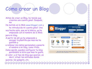 El documento explica cómo crear un blog en Blogger.com, incluyendo elegir un nombre y plantilla, y agregar entradas con títulos, texto, imágenes, videos y enlaces. Para agregar una entrada, se selecciona "creación de entradas" y se completa un cuadro con título y contenido. Luego se puede publicar la entrada o guardarla como borrador. El documento también explica cómo insertar imágenes, videos y enlaces en una entrada de blog.