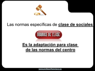 Este documento presenta las normas y la organización de una clase de sociales. Se dividen en normas para los alumnos y para el profesor. Para los alumnos se especifican las razones positivas y negativas y sus correspondientes puntos. Para el profesor se indican sus responsabilidades. También se explica la metodología de la clase con presentaciones, actividades del libro, de vocabulario y online. Se proponen actividades voluntarias creativas y de investigación. Finalmente se detalla la forma de puntuación.