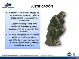Este documento presenta un curso sobre Ciencia, Tecnología y Sociedad (CTS) con el objetivo de formar personas responsables y éticas para participar en problemas de su entorno evaluando los impactos de la ciencia y tecnología desde perspectivas éticas, políticas y estéticas.