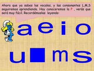 Este documento presenta una lección para niños sobre la letra P. Introduce la letra resaltando su sonido y grafema, e incluye ejercicios de identificación, clasificación y lectura de palabras que contienen P. También explica el uso de palabras como "ese", "esa", "esos" y "esas", e incluye oraciones de ejemplo para reforzar los conceptos. Al final, anima a los estudiantes a repasar la lección y se despide hasta la próxima.
