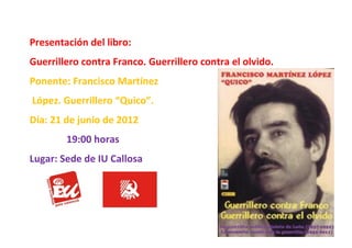 El documento anuncia una presentación de libro el 21 de junio de 2012 a las 19:00 horas en la sede de IU Callosa. El libro se titula "Guerrillero contra Franco. Guerrillero contra el olvido" y el ponente será Francisco Martínez López, conocido como el guerrillero "Quico".