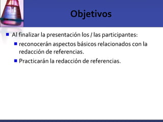 Este documento presenta información sobre cómo redactar referencias bibliográficas de acuerdo al Manual de Estilo de ACS. Explica la importancia de citar fuentes para añadir credibilidad, profundidad y claridad a un escrito. Además, detalla los elementos necesarios para redactar referencias como el autor, título, año y volumen de publicaciones. Finalmente, ofrece ejemplos de cómo citar referencias en el texto y la estructura básica para listar las referencias bibliográficas.