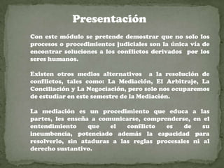 Este documento presenta un módulo sobre mediación. Explica que la mediación es un procedimiento alternativo para resolver conflictos que educa a las partes y les enseña a comunicarse y entenderse para resolver el conflicto por sí mismos. El objetivo del módulo es que los estudiantes aprendan herramientas de comunicación y procedimientos para la resolución de conflictos a través de la mediación. También incluye el cronograma de actividades y evaluaciones para el curso.
