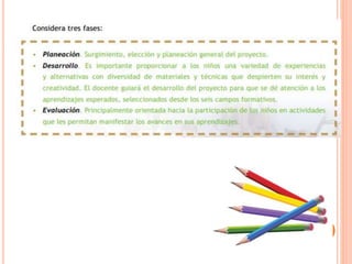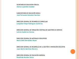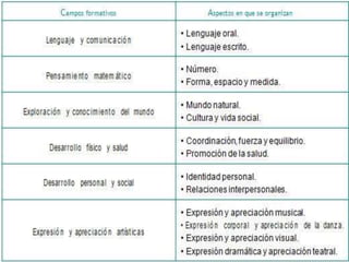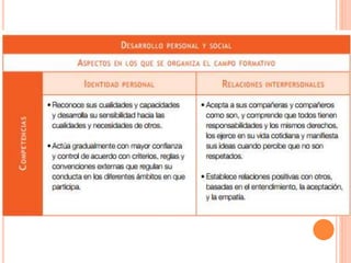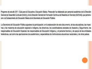 Este documento presenta los lineamientos generales del programa de estudios de educación preescolar en México. Describe los objetivos de la educación preescolar, los campos formativos que componen el currículo y los estándares esperados para cada campo. Además, ofrece orientaciones pedagógicas sobre la planificación, evaluación, uso de tecnología y creación de ambientes de aprendizaje inclusivos, democráticos y basados en el respeto.